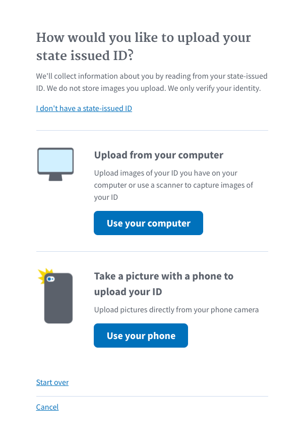 - Sur la page “Comment souhaitez-vous télécharger votre identifiant d’état?”, Choisissez de télécharger des images de votre identifiant à partir de votre ordinateur ou de votre téléphone (prenez une photo avec l’appareil photo de votre téléphone ou téléchargez une image de la photothèque de votre téléphone).