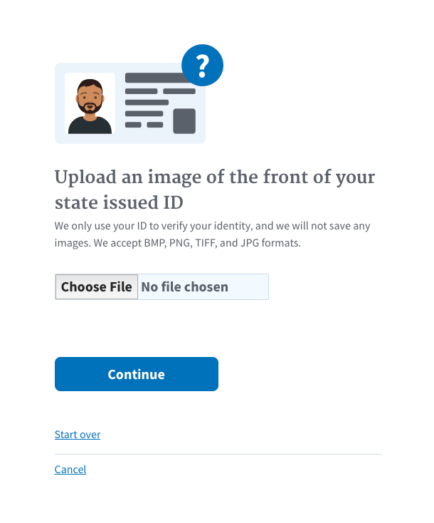 - Téléchargez ou prenez une photo du recto de votre identifiant émis par l’État en cliquant sur “Choisir un fichier”, en prenant une photo ou en téléchargeant une de votre photothèque, puis en cliquant sur “Continuer”.