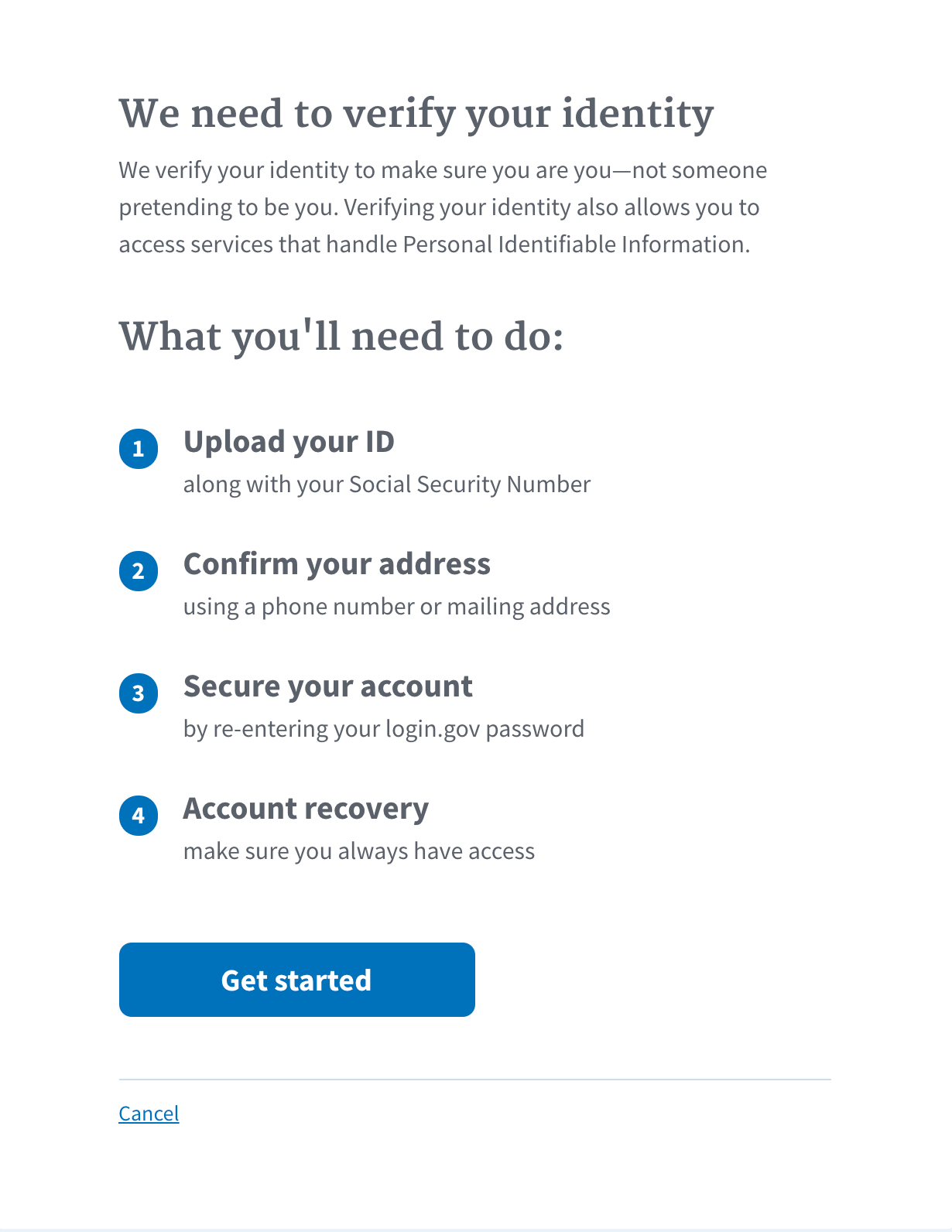 - When you are signing in or creating an account, you will see the “We need to verify your identity” page. Click on “Get started”.