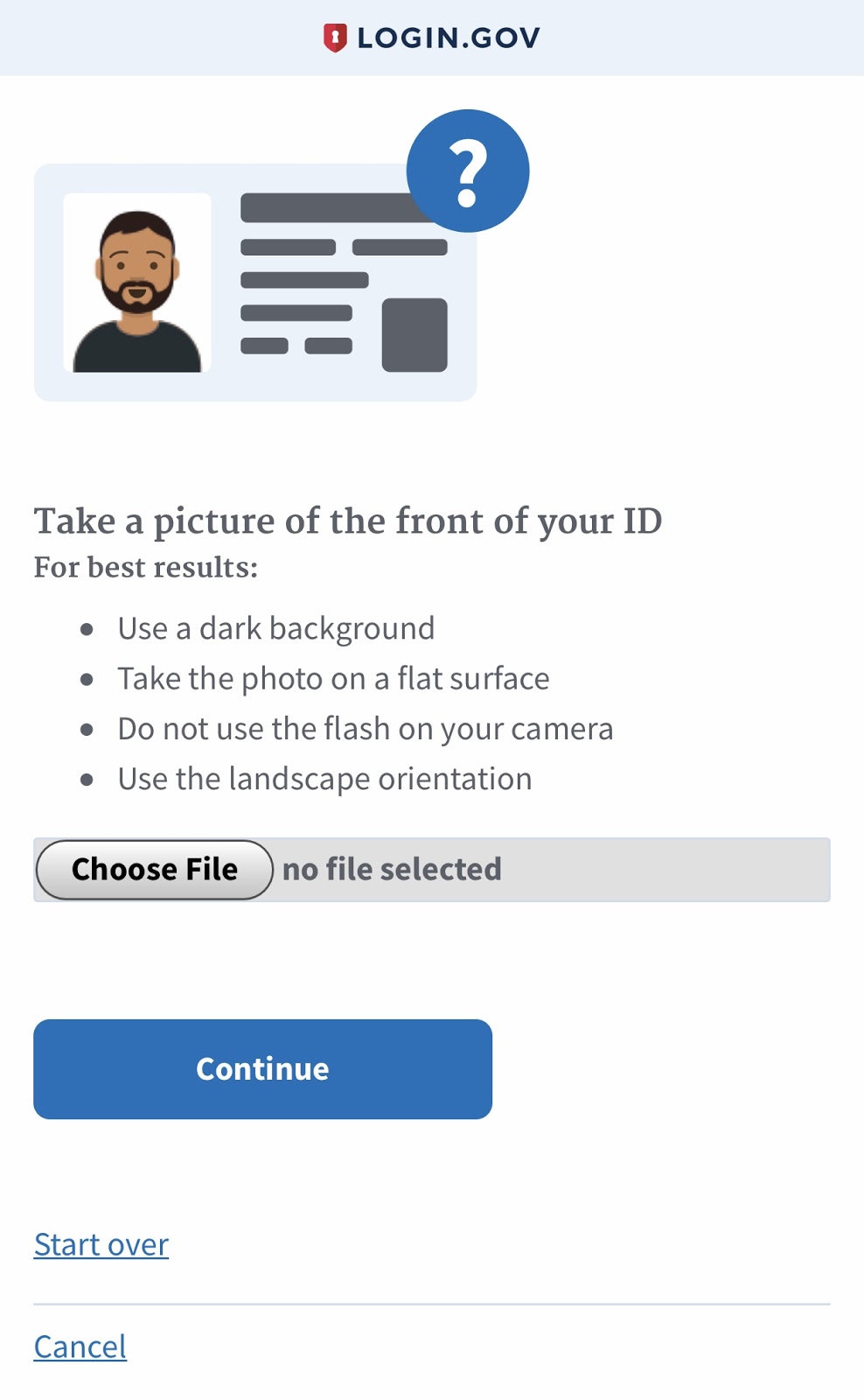 If a government application requires identity verification, login.gov will ask you to verify your identity the first time you sign in to it. You will need to have your state-issued ID (like your driver’s license) or a picture of the front and the back of it. Use the following steps to verify your identity on login.gov: